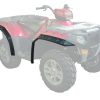 Zestaw poszerzeń błotników do pojazdów ATV, wykonany z wytrzymałego polietylenu, zwiększa ochronę kierowcy i pasażera przed błotem i odpryskującymi odłamkami, łatwy montaż, zestaw zawiera 4 poszerzenia błotników i sprzęt montażowy